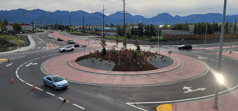 This project, derived from the larger program, included mainline expansion, a new bridge, major utility relocation, new roundabout terminals, pedestrian accommodations and MOT for approximately 70,000 to vehicles per day. To match the mainline that had previously been constructed on either side of the interchange on the highway, the bridge over Dowling Road was replaced and the mainline was reconstructed from a narrow, substandard cross section to a full width cross section that consists of six divided mainline lanes, full width shoulders, and median ditches. The project reconstructed the interchange roundabout terminals, increasing their size, and relocating Dowling Road to the north to increase capacity. The roundabouts are Alaska’s largest multi-lane roundabouts. Rectangular Rapid Flashing Beacons were designed to aid with pedestrian and bicycle crossings.
